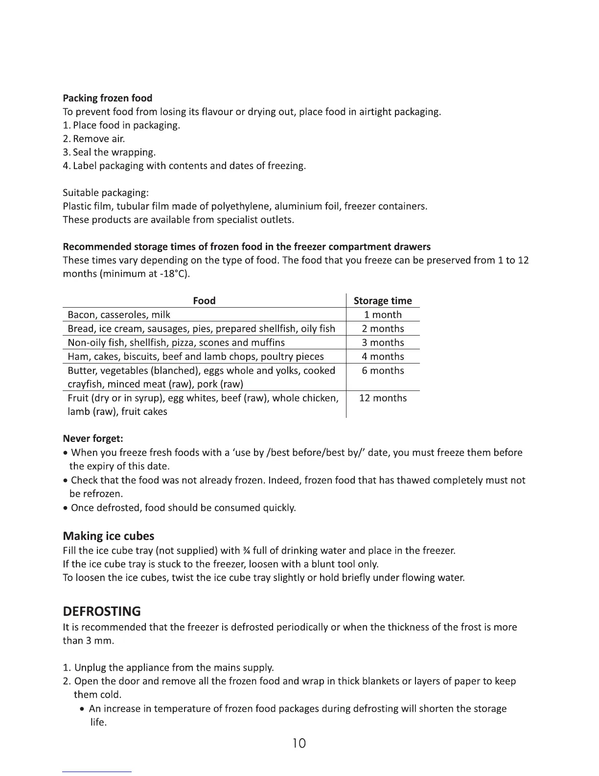 Lec CF100LW MK2 - Defrosting; Packing frozen food