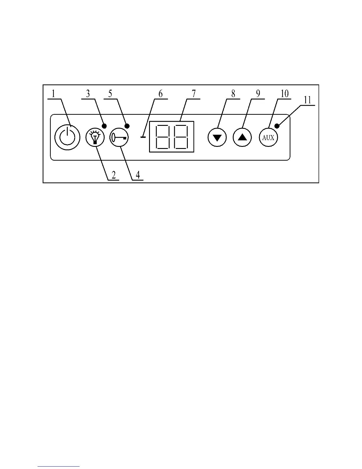 Button (8) ‘▼’ - minimum temperature preview or parameter value decrease,