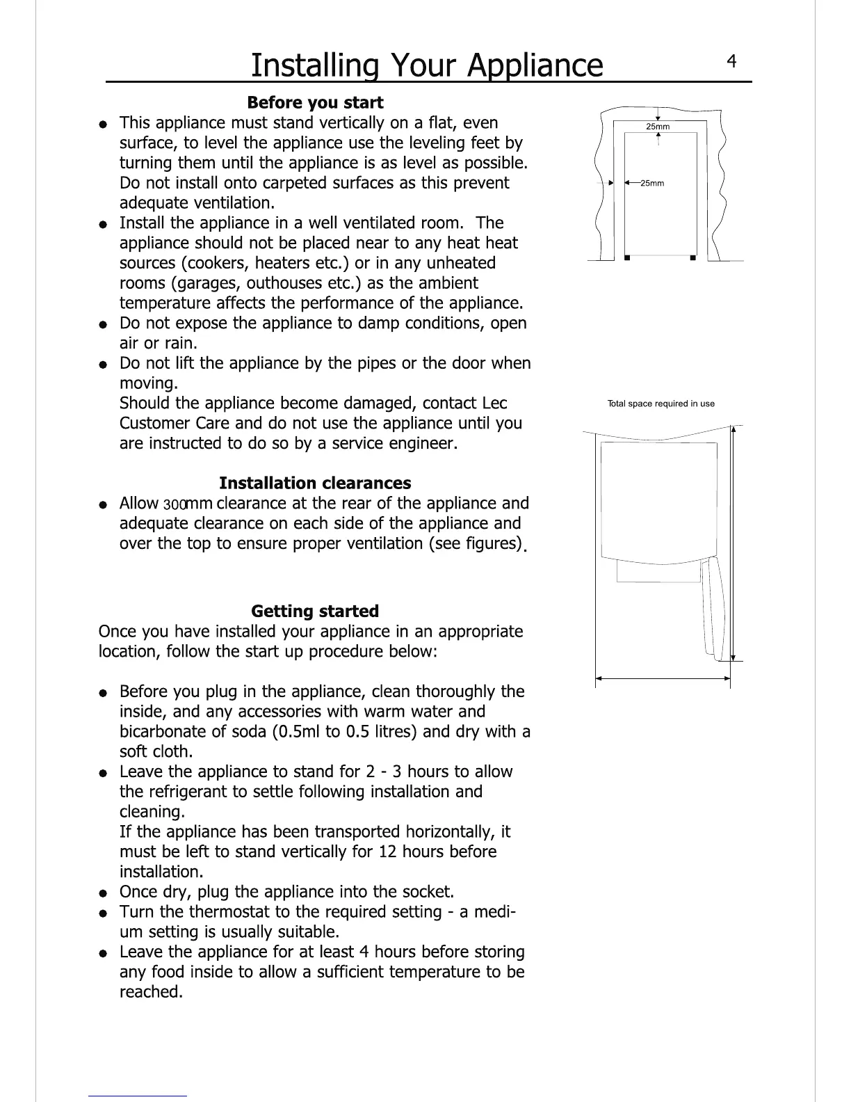 Lec L5511W - Installing Your Appliance; Installation Site and Clearances; Initial Setup Procedure