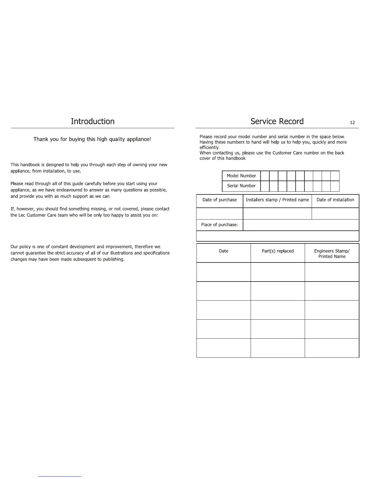 Lec TF50152W - Service Record; Record Appliance Details