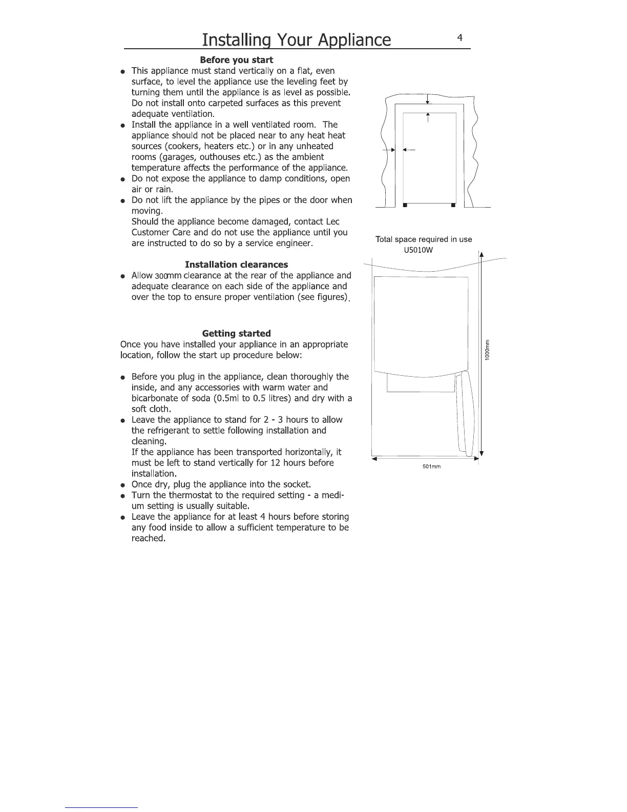 Lec U5010W - Installing Your Appliance; Before You Start; Installation Clearances; Getting Started