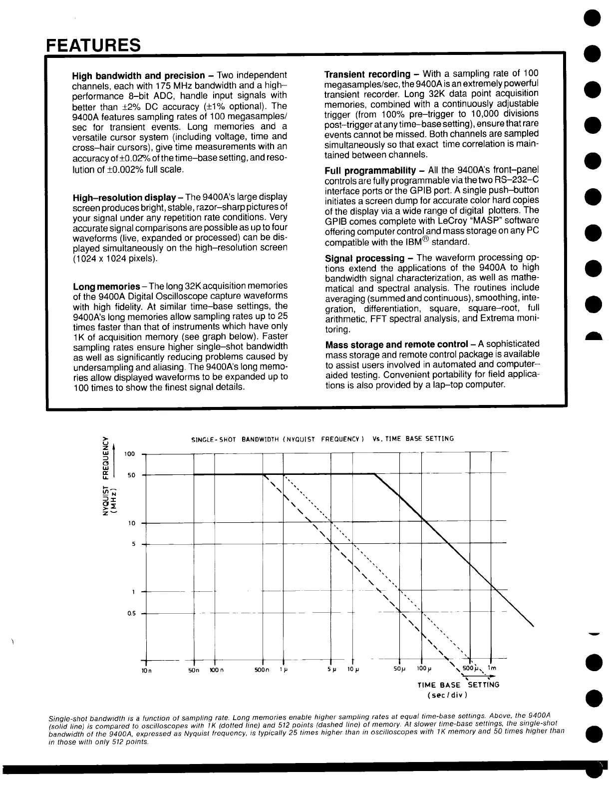 bandwidth of the 9400A, expressed as Nyquist frequency, is typically 25 times higher than in oscilloscopes with 1K memory and 50 times higher than