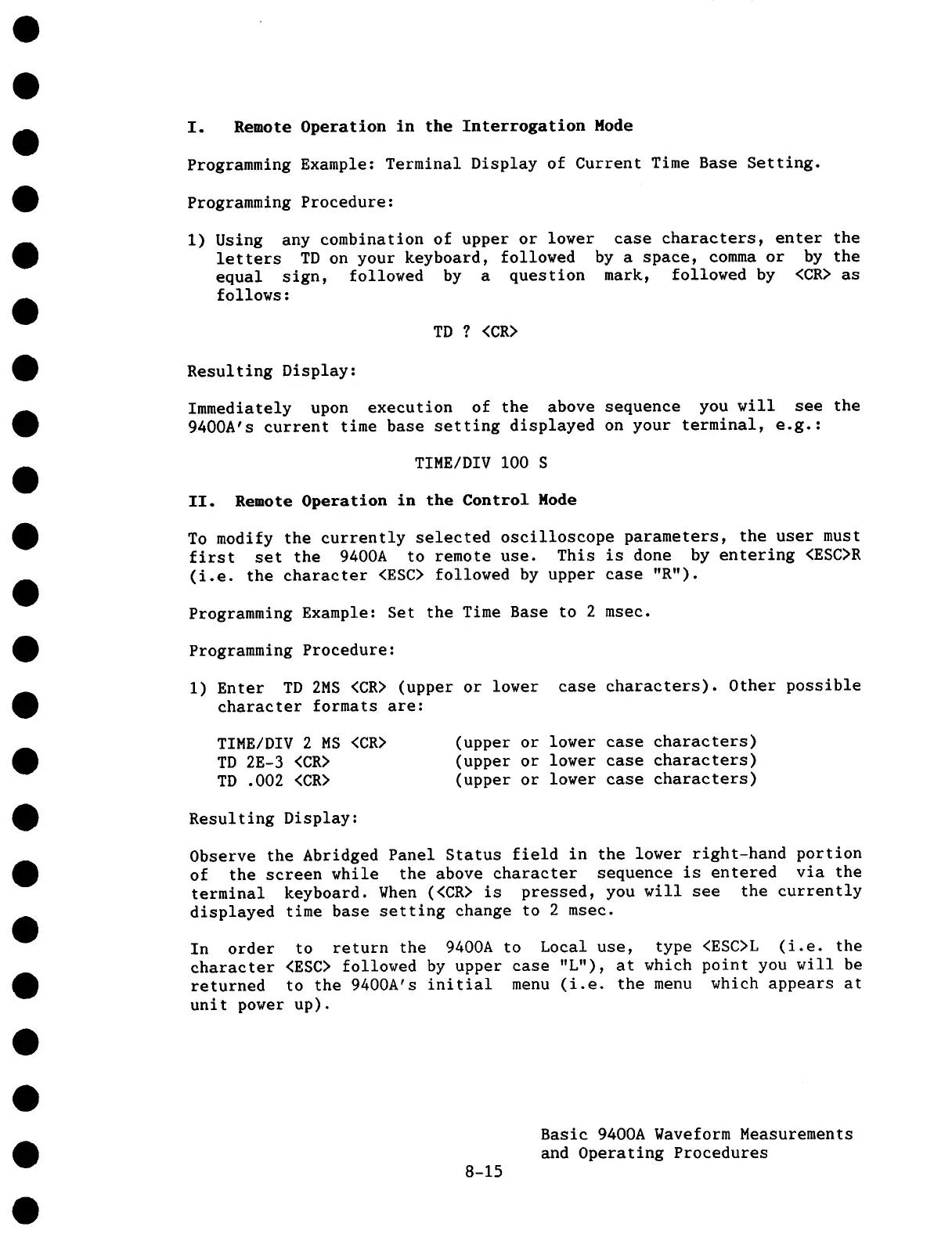 9400A’s current time base setting displayed on your terminal, e.g.: