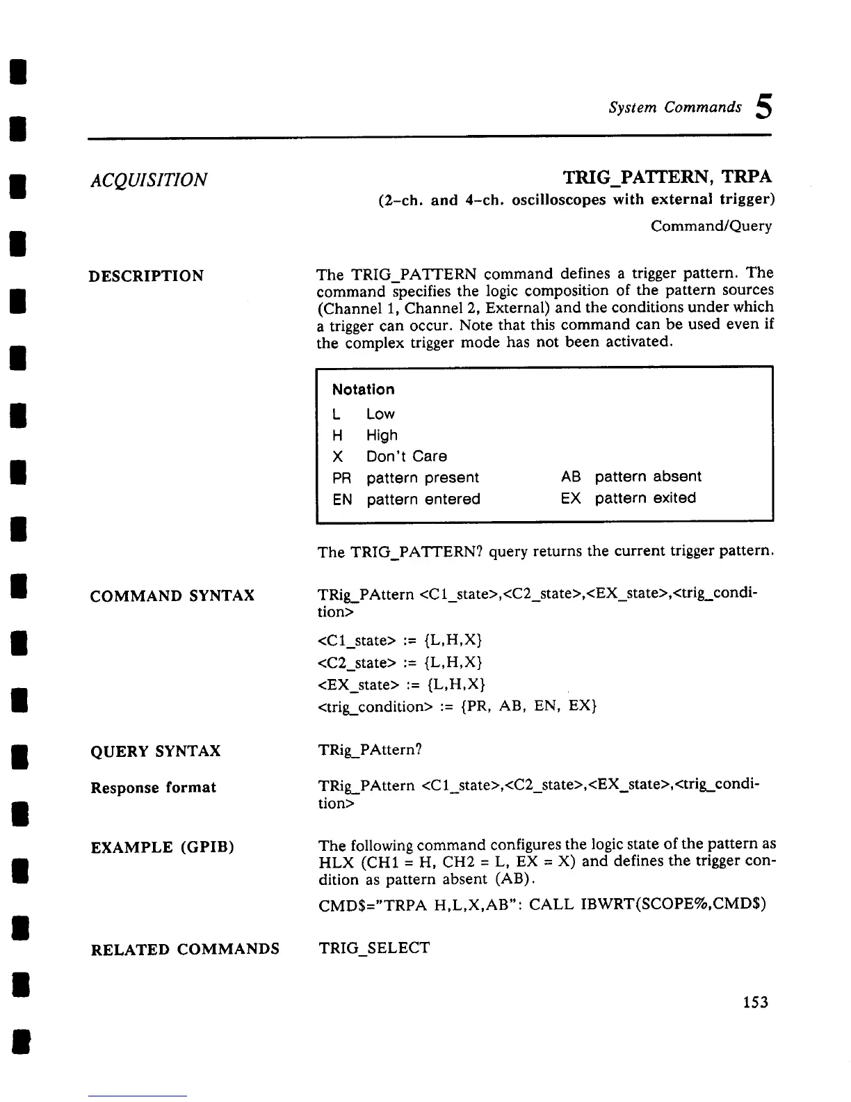 The TRIG PATTERN command defines a trigger pattern. The