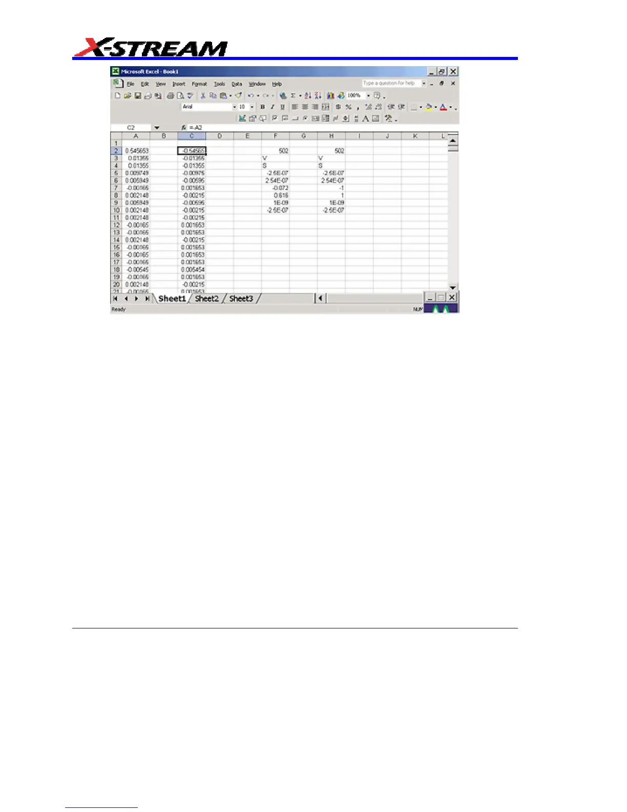 data point in column A. The instrument automatically opens Excel, puts the waveform data in the