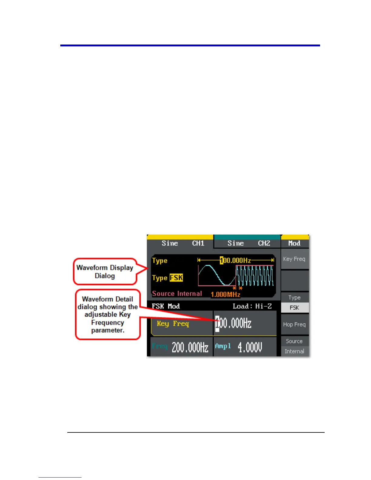 41), the WaveStation shows the FSK Operation menu and corresponding