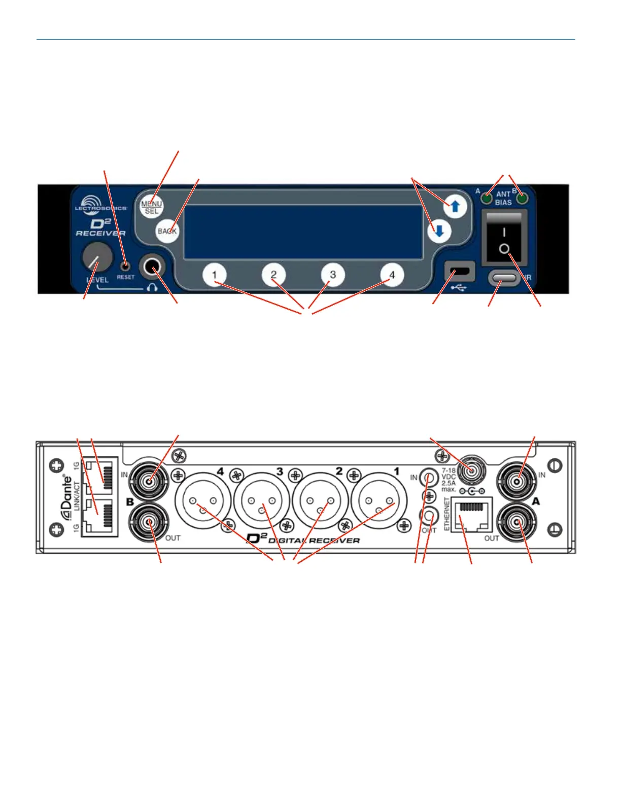Lectrosonics D2 DSQD - Panels and Features; Front Panel Controls and Indicators; Rear Panel Connections and Ports