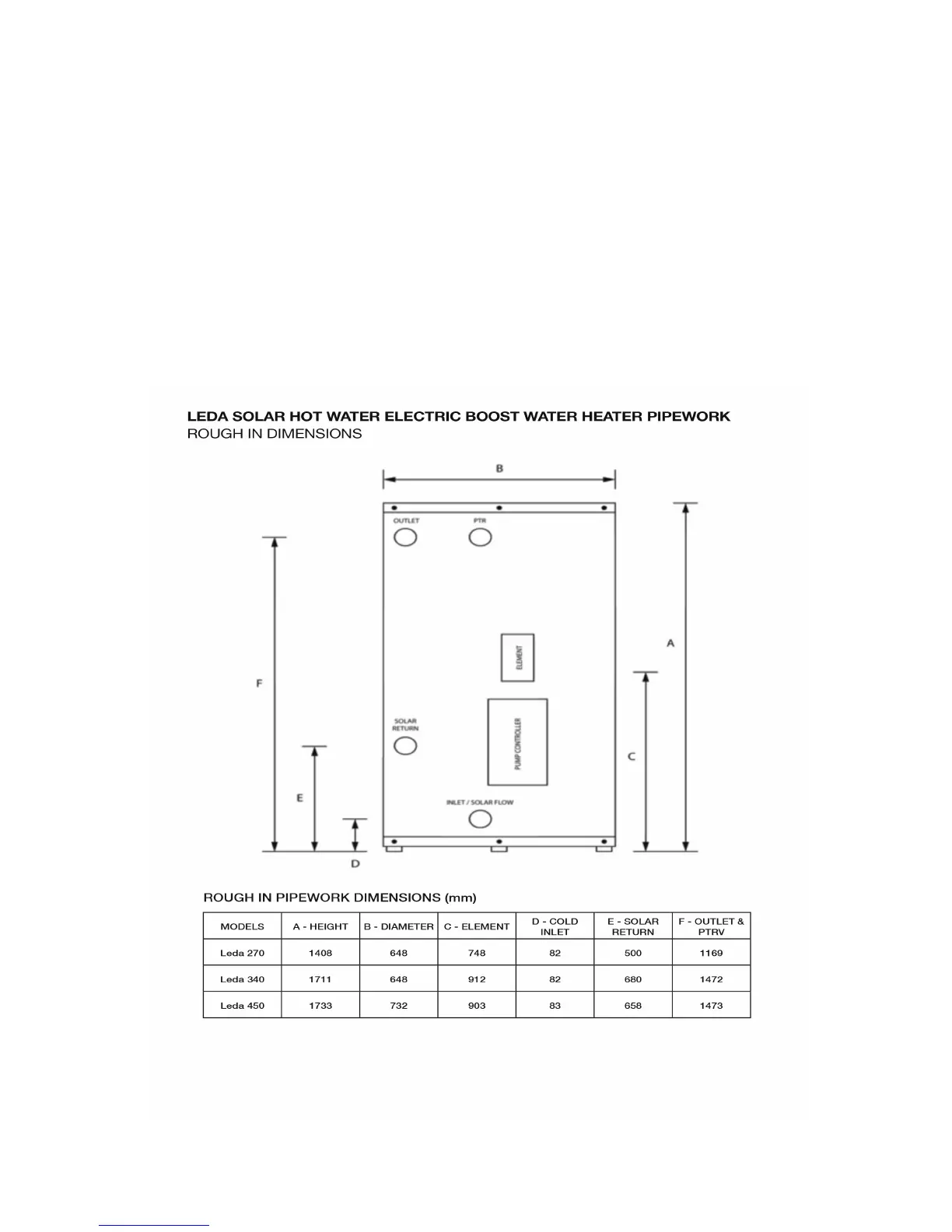 Leda 270 - Installing the Hot Water Storage Tank; Rough in Dimensions; Rough in Pipework Dimensions