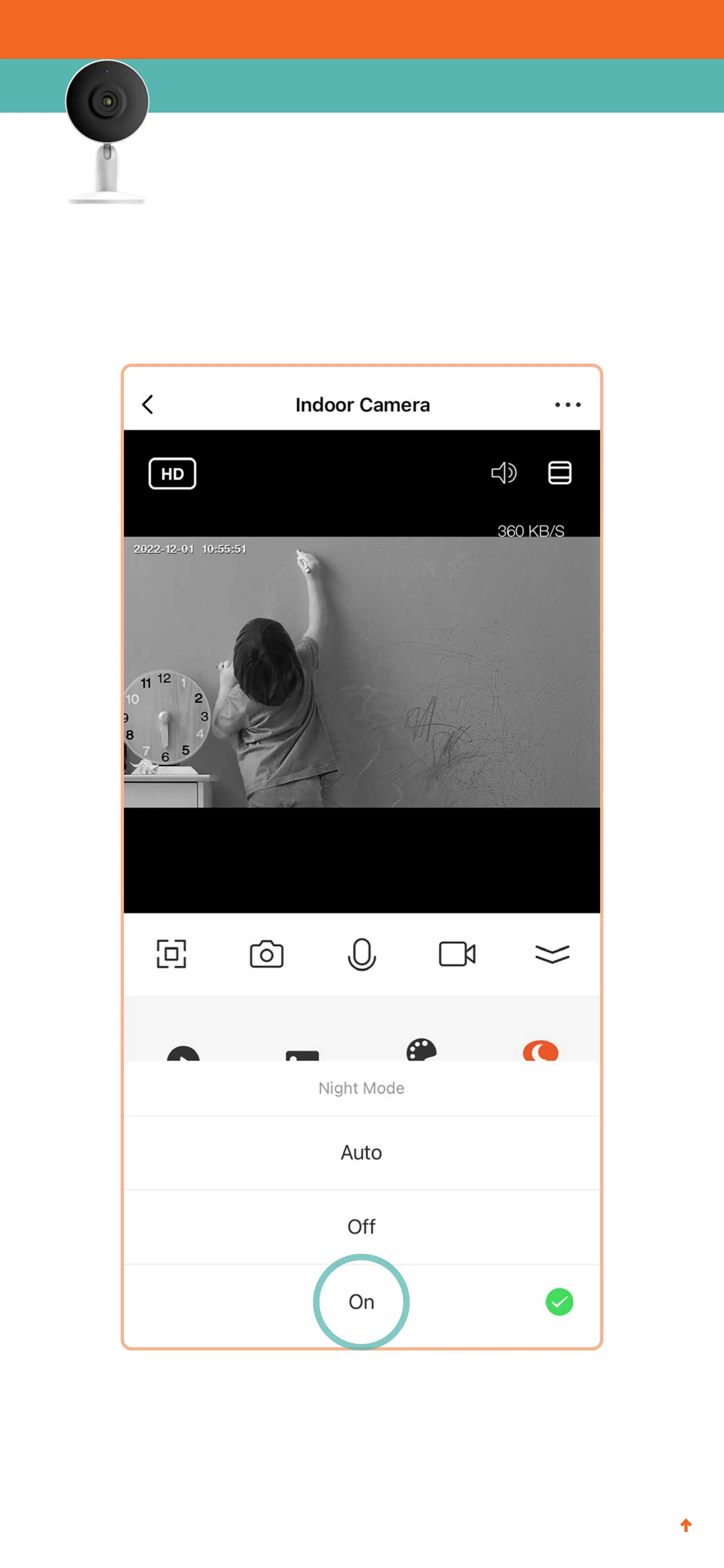 4. Tap On. Your camera will be able to capture footage at night.