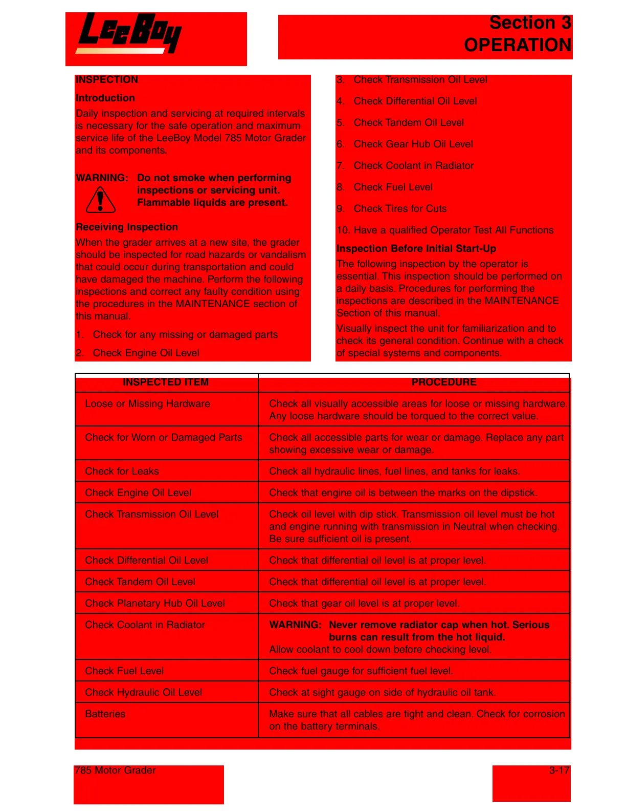 Check for Leaks Check all hydraulic lines, fuel lines, and tanks for leaks.
