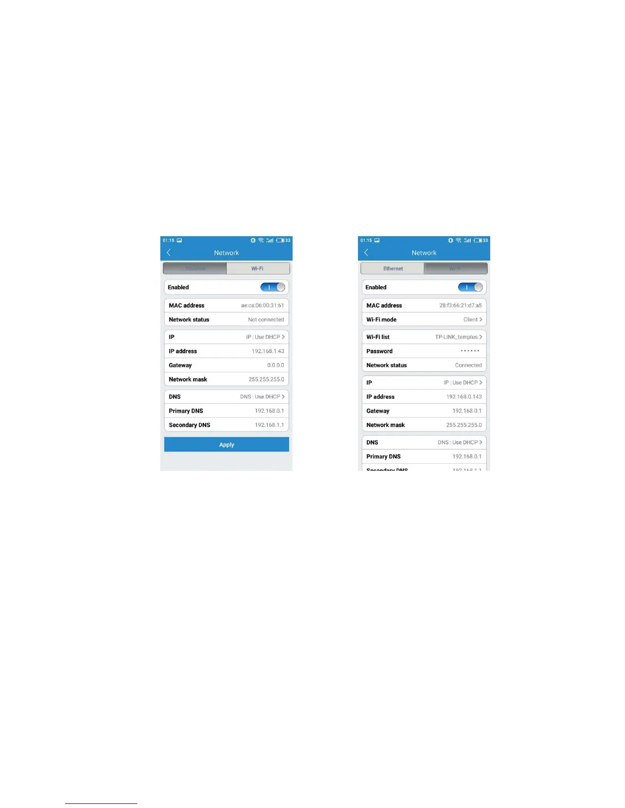 network status and the IP information.