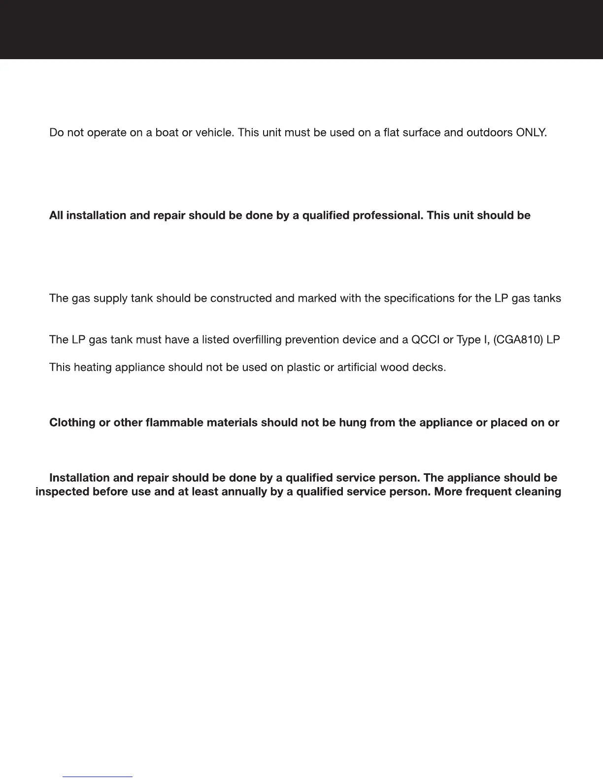 • Do not store a spare propane tank on or near this unit.