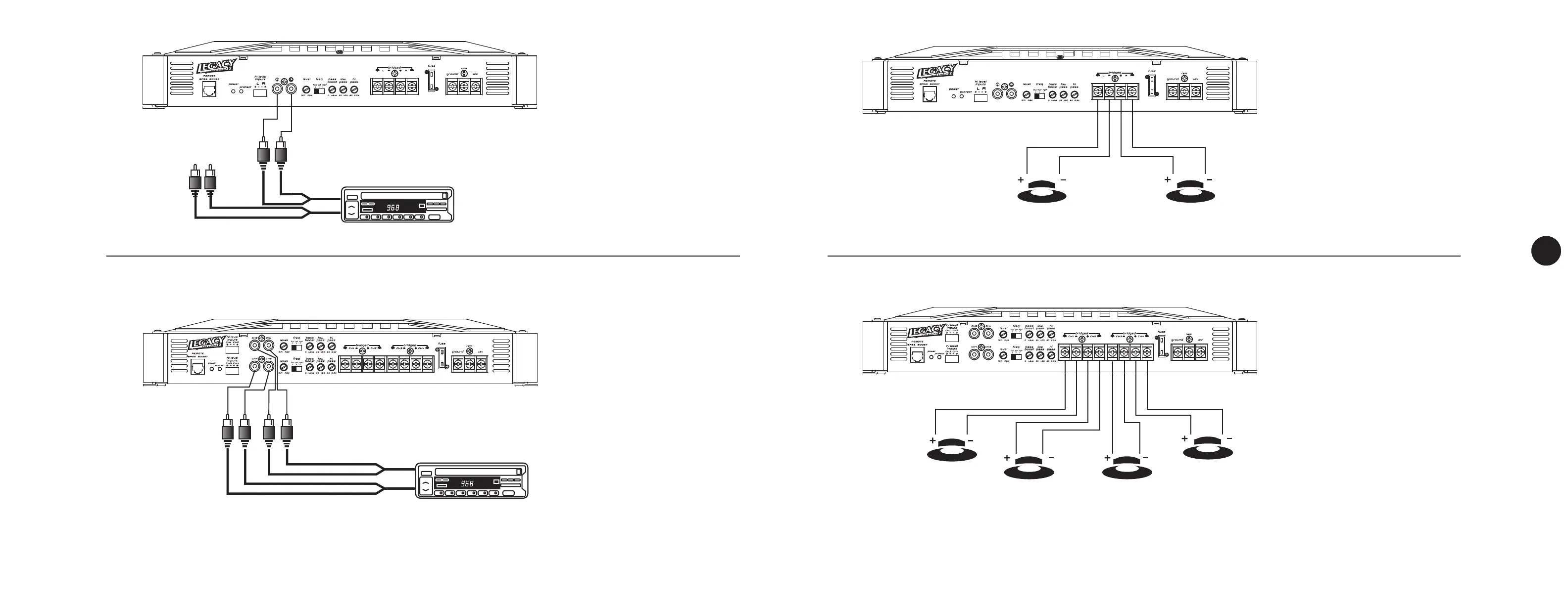 Legacy LA470 - Speaker Connections; Bridged Input Connection; 4 CH Bridged Input (2 CH Source); Basic Stereo Output