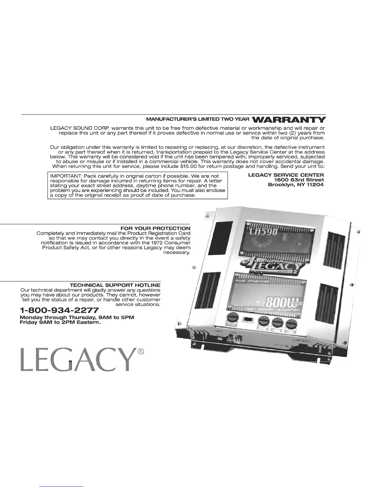Legacy LA790 - Warranty and Support; Manufacturers Limited Warranty; Technical Support Hotline