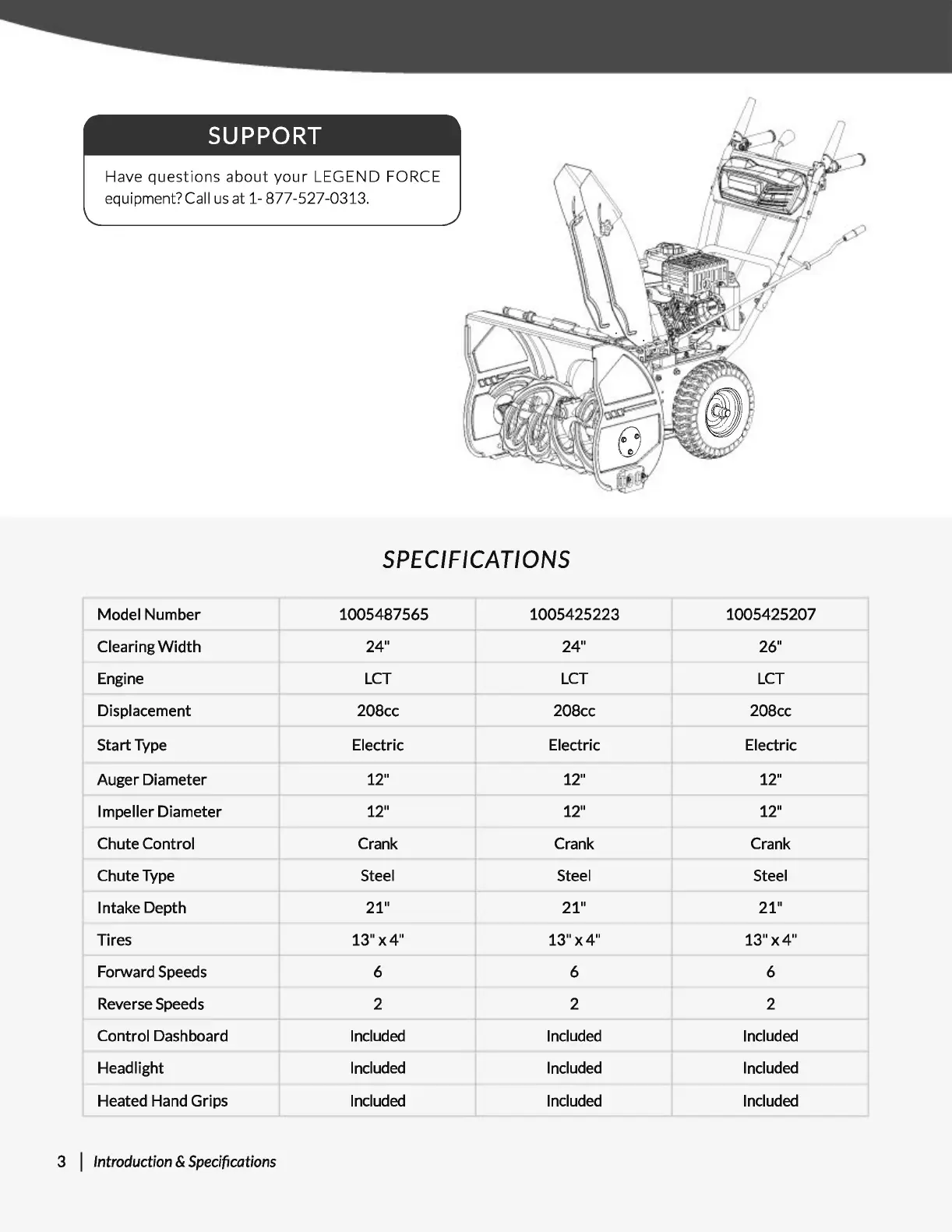 LEGEND FORCE 1005487565 - Support and Specifications; Customer Support Contact; Technical Specifications