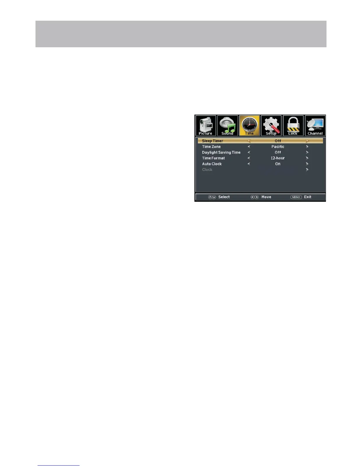 The Time menu includes adjustment of settings for your local time zone and daylight savings time. The clock will adjust