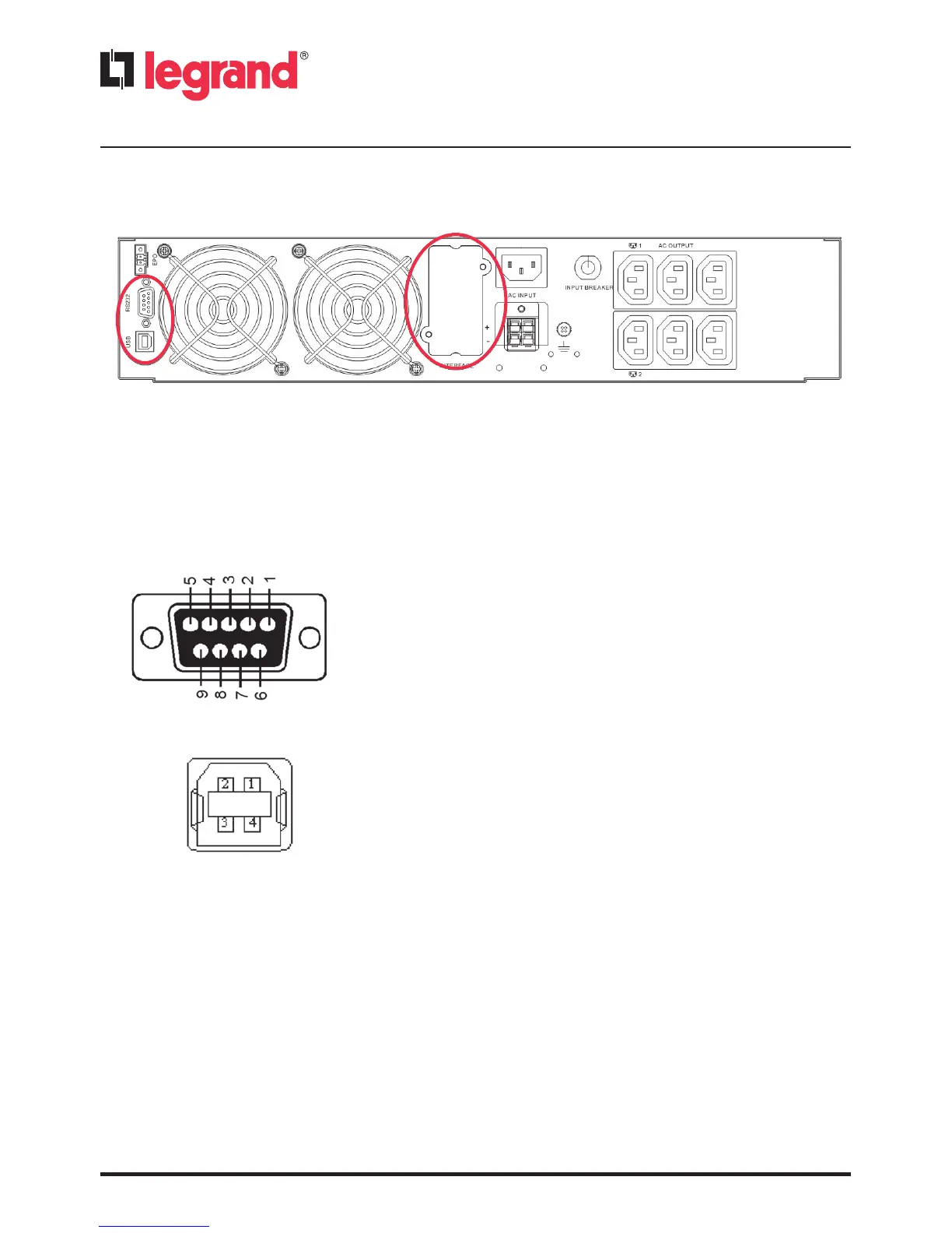 The following figures show the pinout of the RS232 and USB interfaces: