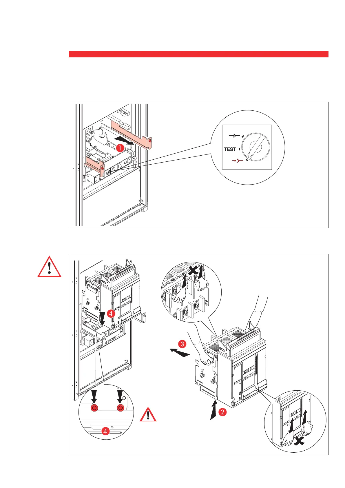 Tirer le rail de positionnement et s’assurer que le disjoncteur est en position débrochée (voir indicateur de position).