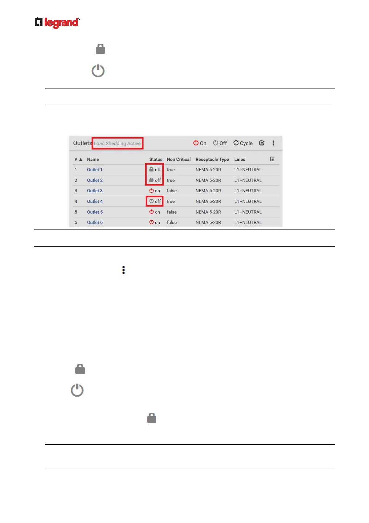 outlets during the load shedding mode. See Off and Lock Icons for Outlets (on page 106).