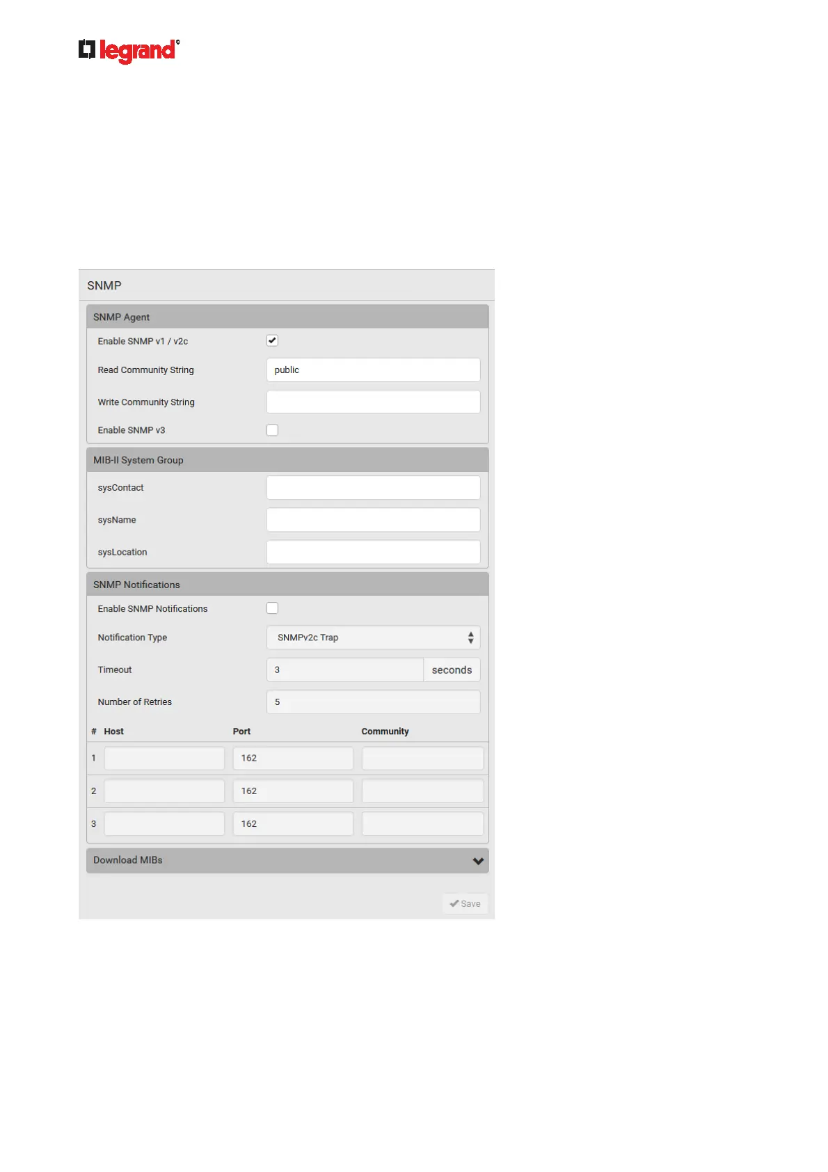 You can enable or disable SNMP communication between an SNMP manager and the Legrand PDU.