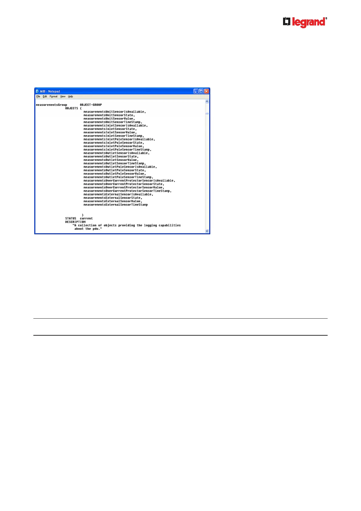 For example, the measurementsGroup group contains objects for sensor readings of Legrand PDU as a