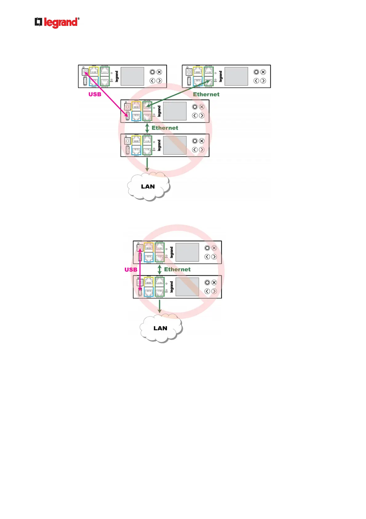 One device is connected to another device via two cascading cables - USB and Ethernet cables.