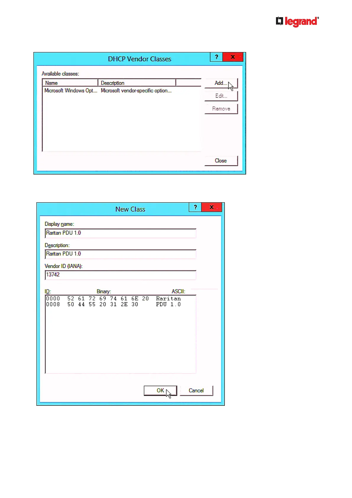 c. Specify a unique name for the vendor class, type "13742" in the "Vendor ID (IANA)" field, and type