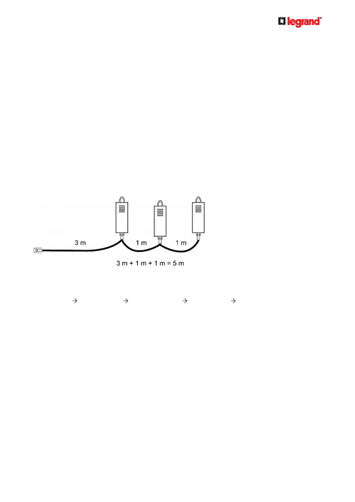 The total cabling length between the Legrand PDU and one DPX-T3H1 is 49' (15 m) as illustrated below.