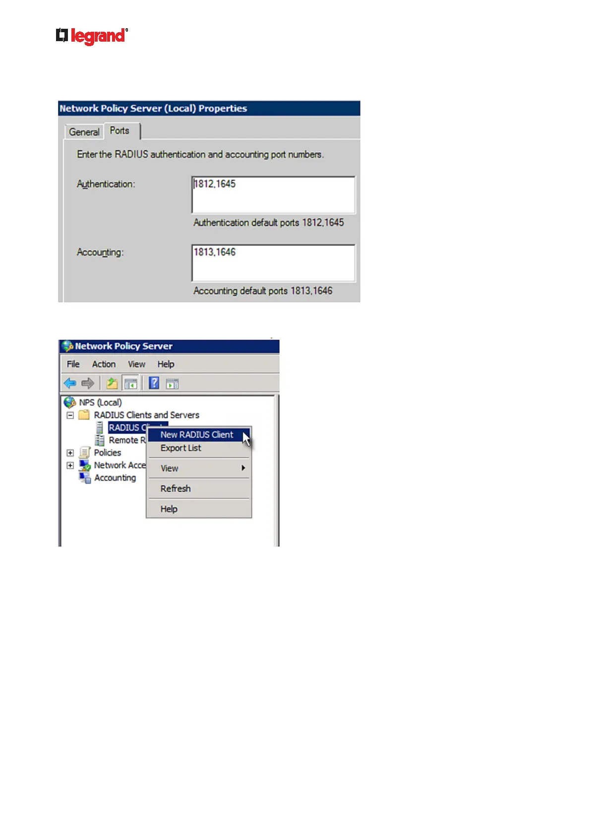 Verify the authentication and accounting port numbers shown in the properties dialog are the same as