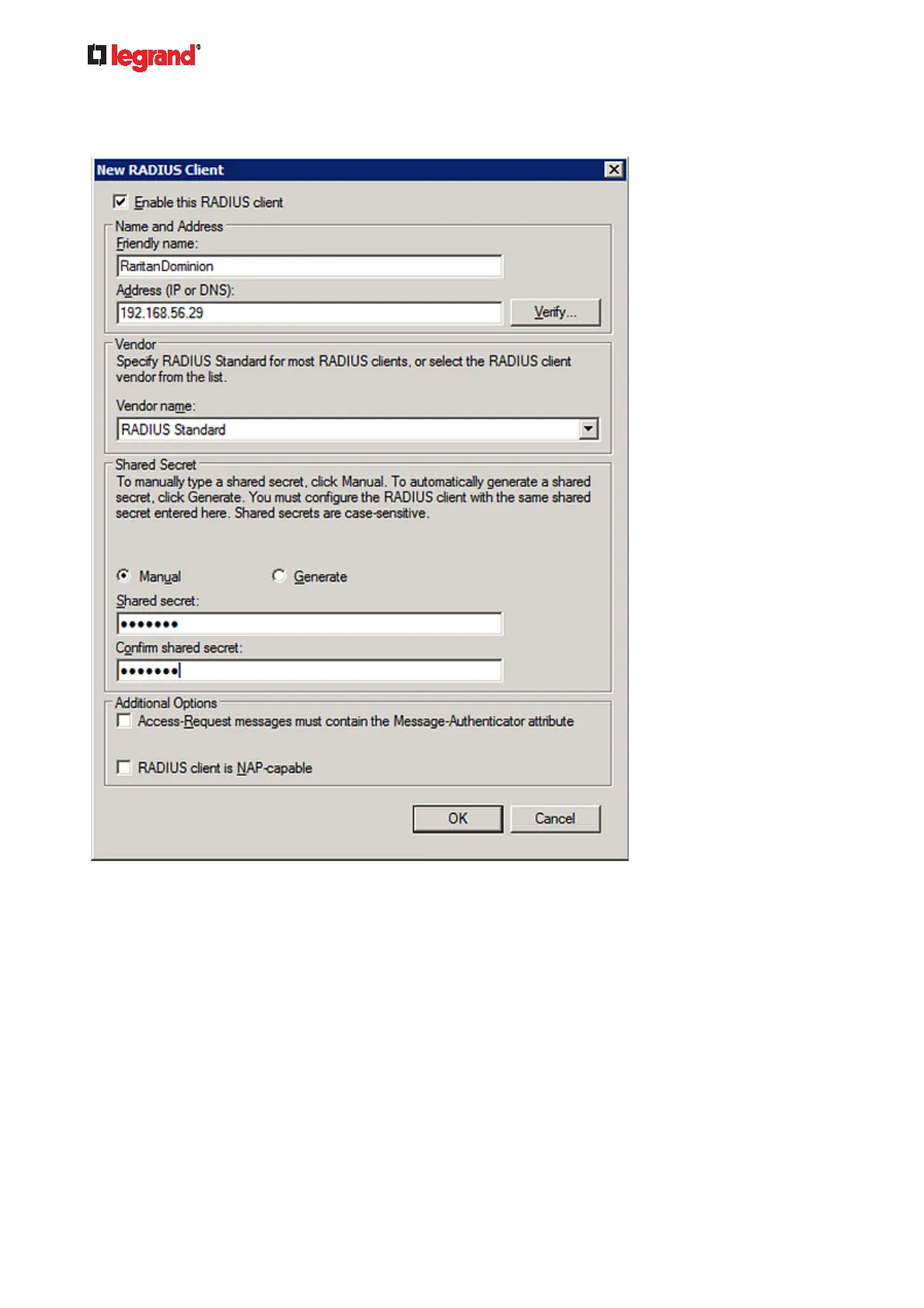f. Type the shared secret in the "Shared secret" and "Confirm shared secret" fields. The shared secret