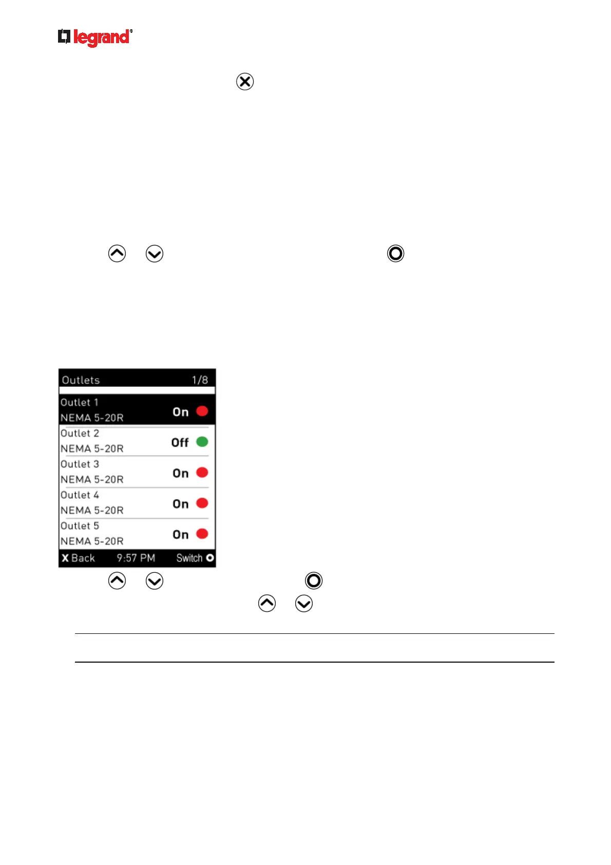 or to select an outlet, and press .
