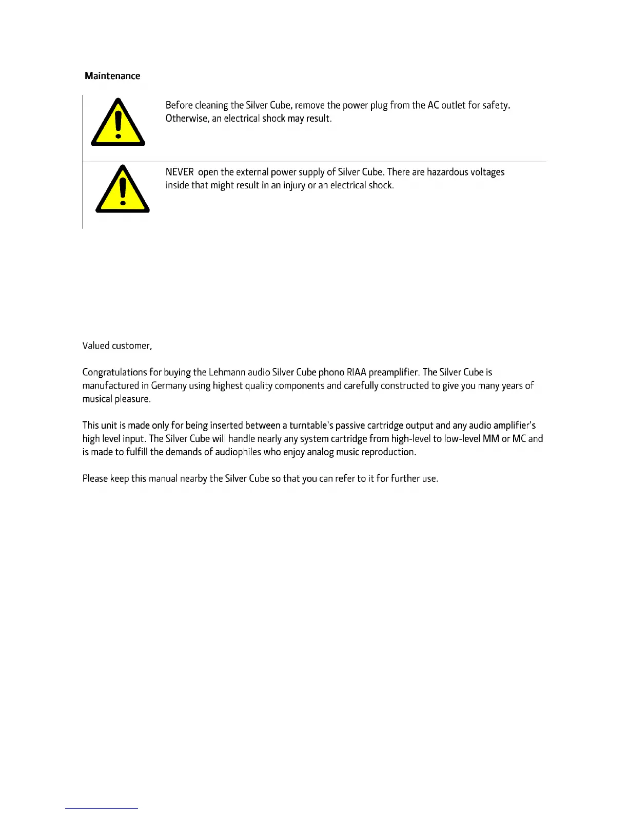 Lehmannaudio Silver Cube - Maintenance and Safety; Maintenance Safety Warnings; Welcome Message