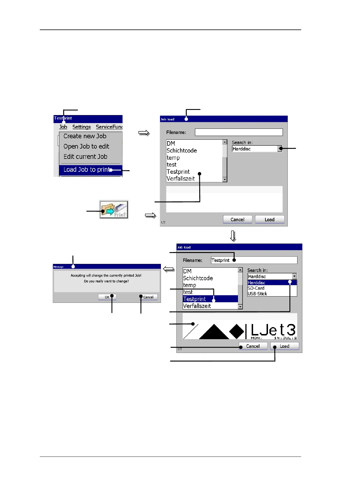 printing. For selection of a job the window “Load job” opens.