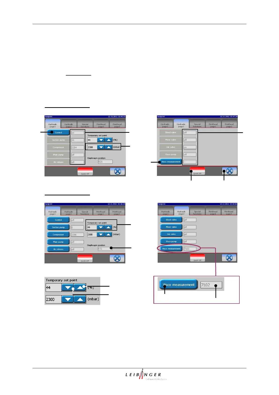 Hydraulic-/Printhead test menu – functional area „Hydraulic functions”