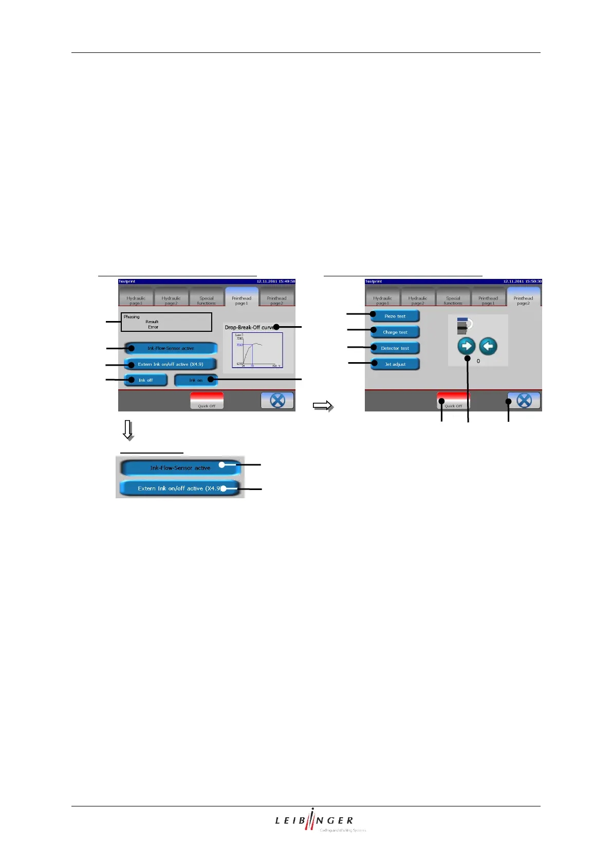 Hydraulic-/Printhead test menu – functional areas „Printhead”