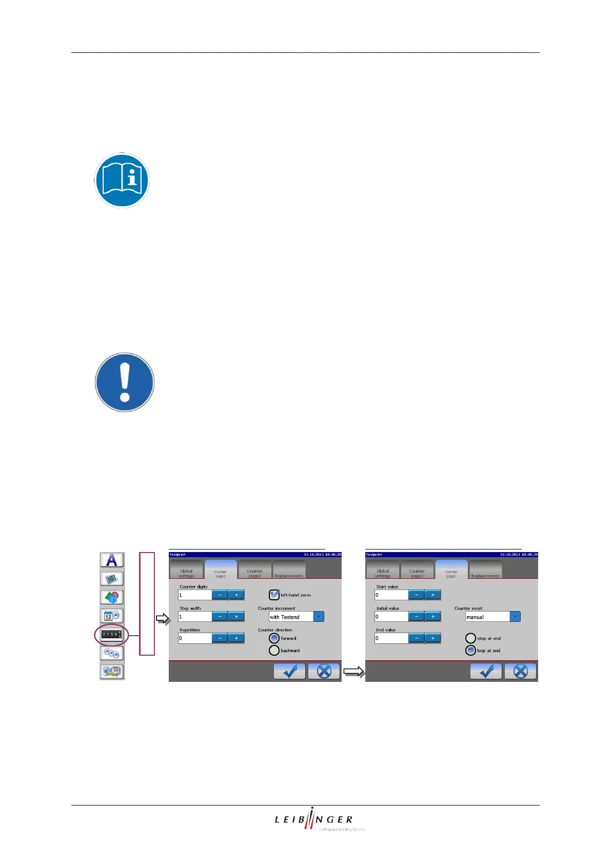 In the two functional areas <Counter page 1> and<Counter page 2> of the menu you