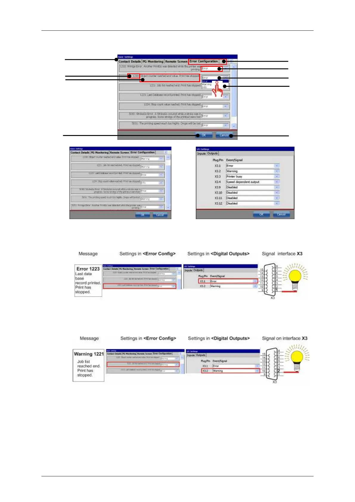 error message with code 1223 pops up and the digital output X3.1 switches.
