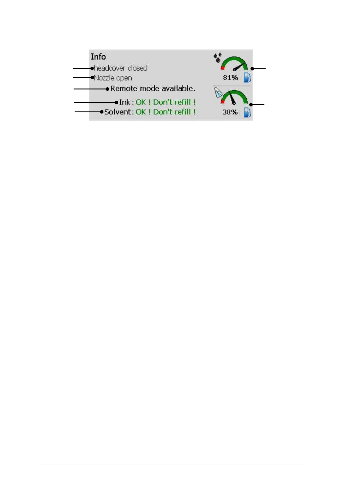 E.g.: ink on, Nozzle closed, Nozzle open, Print stop, Print start, Print busy etc.