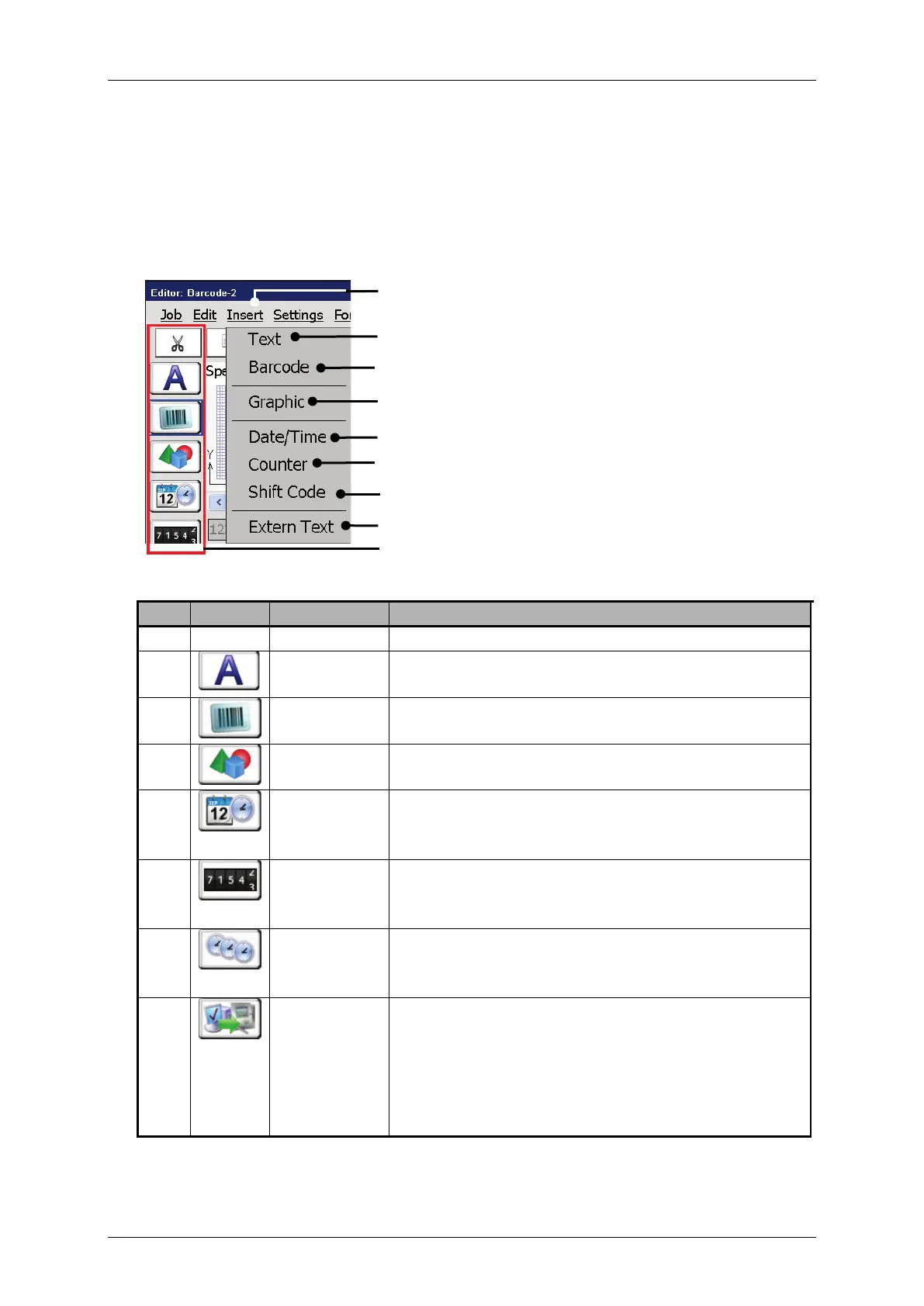 With the button <Insert> you can select tools to create printing elements (texts,