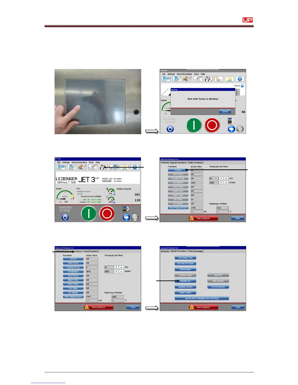 2. Touch the softkey <Hydraulic settings> (1) and switch off the <Control>-button (2).