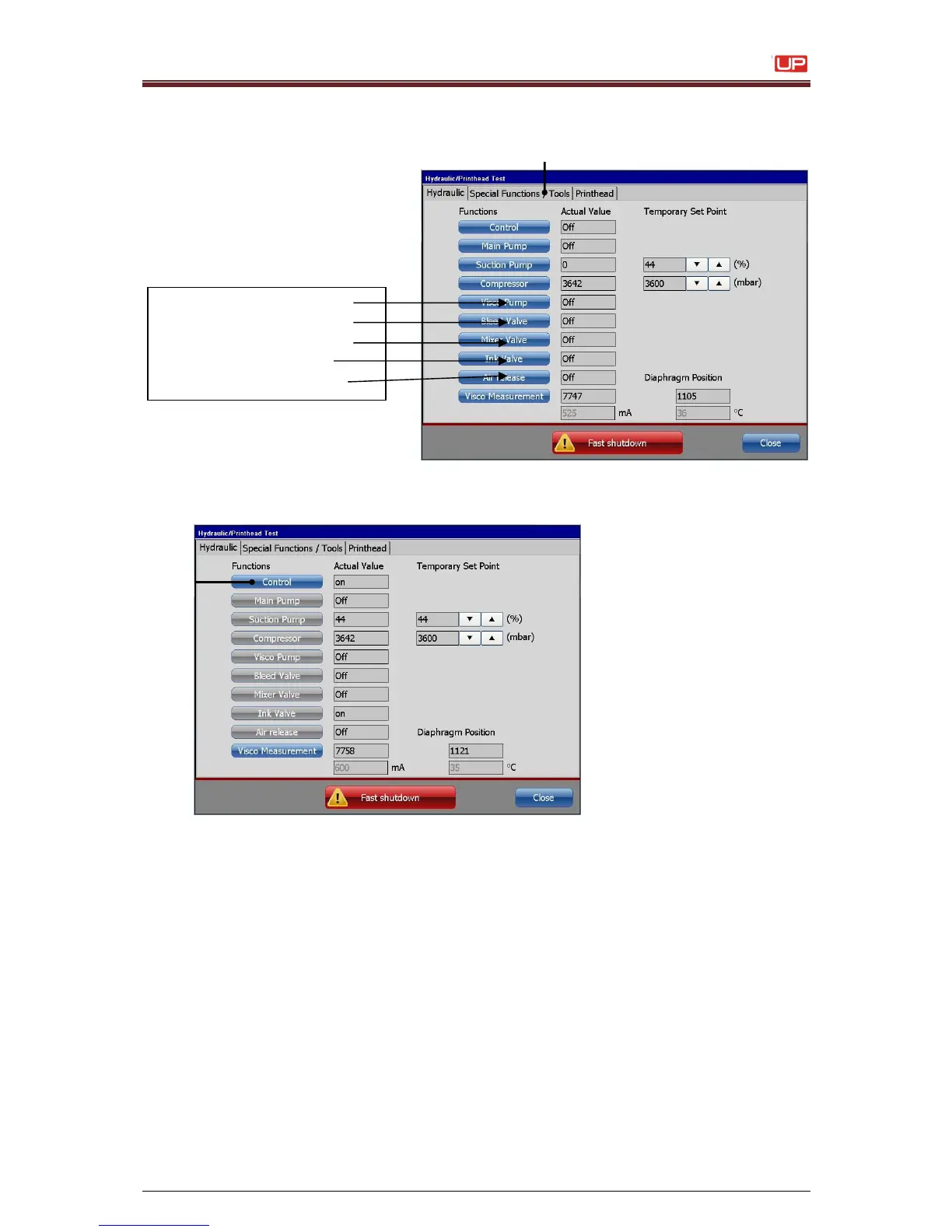 25. Test the reliability performance of the valves in menü <Special Functions/Tools> (1).