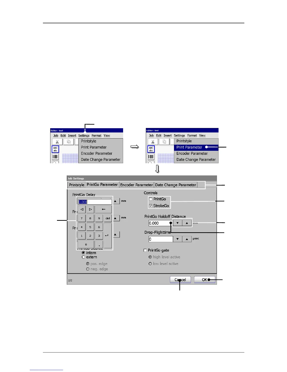 (e.g. PrintGo-distance, encoder source, alignment, etc.).