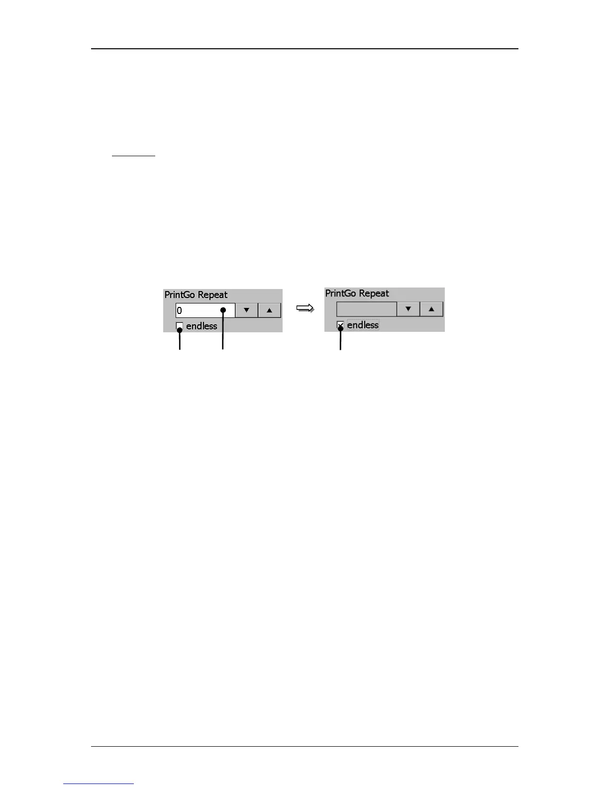 1 – Display field <PrintGo-Repeat> 3 – Control box <Endless> active