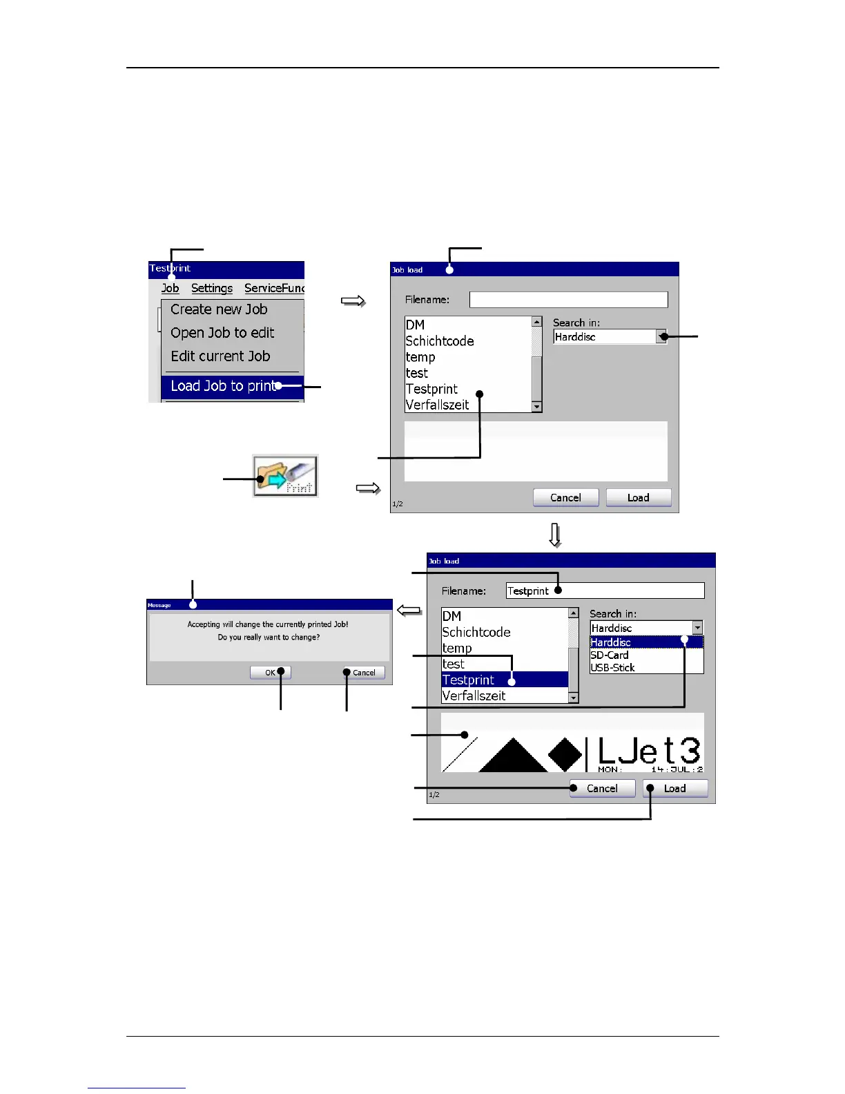 printing. For selection of a job the window “Load job” opens.