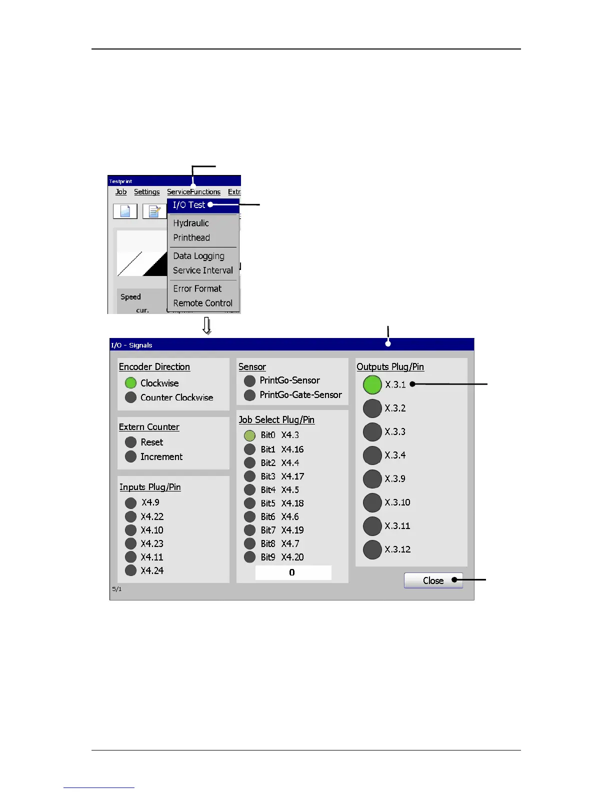 With the option <I/O Test> (2) the menu „I/O-Signals (3)“ is displayed. The menu