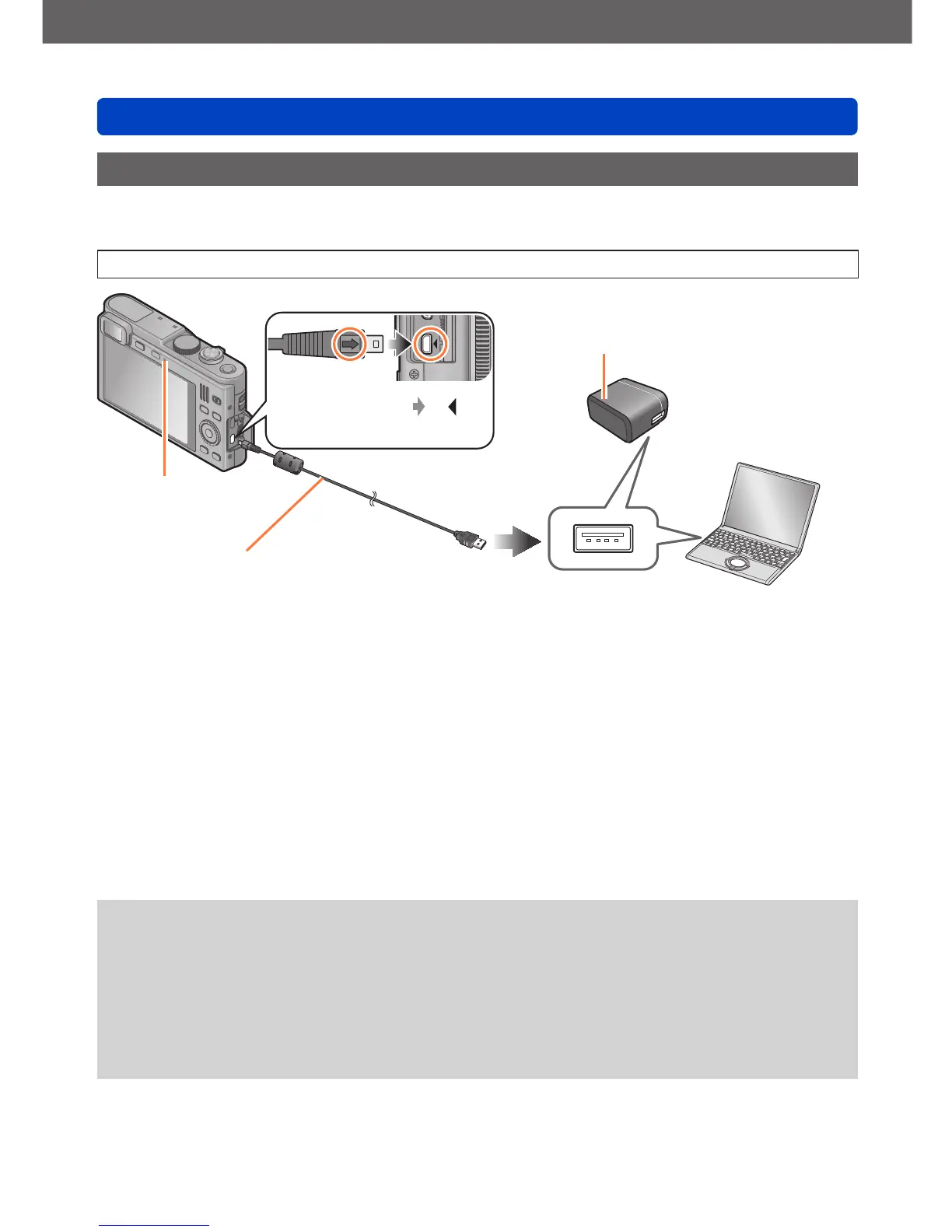 Connect the charger/AC adapter and the camera using the USB cable, and plug the AC