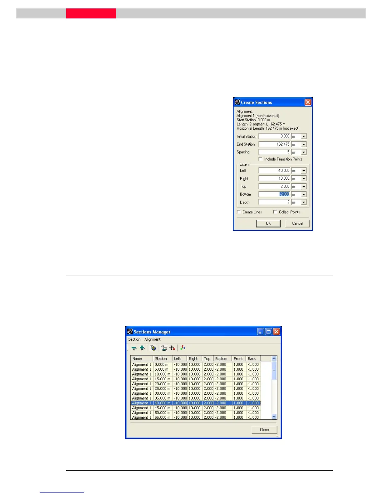 The Sections Manager lists the stations along the alignment. First, we will adjust the extents of