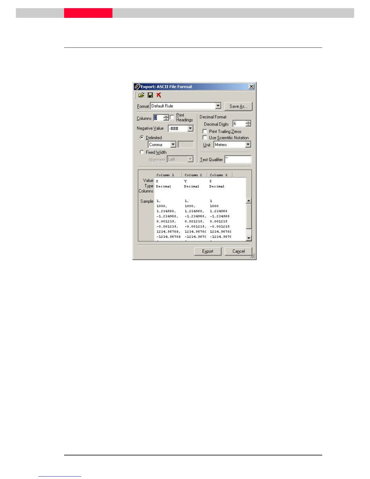 From this dialog the export format of the ASCII file can be manipulated. The settings can be