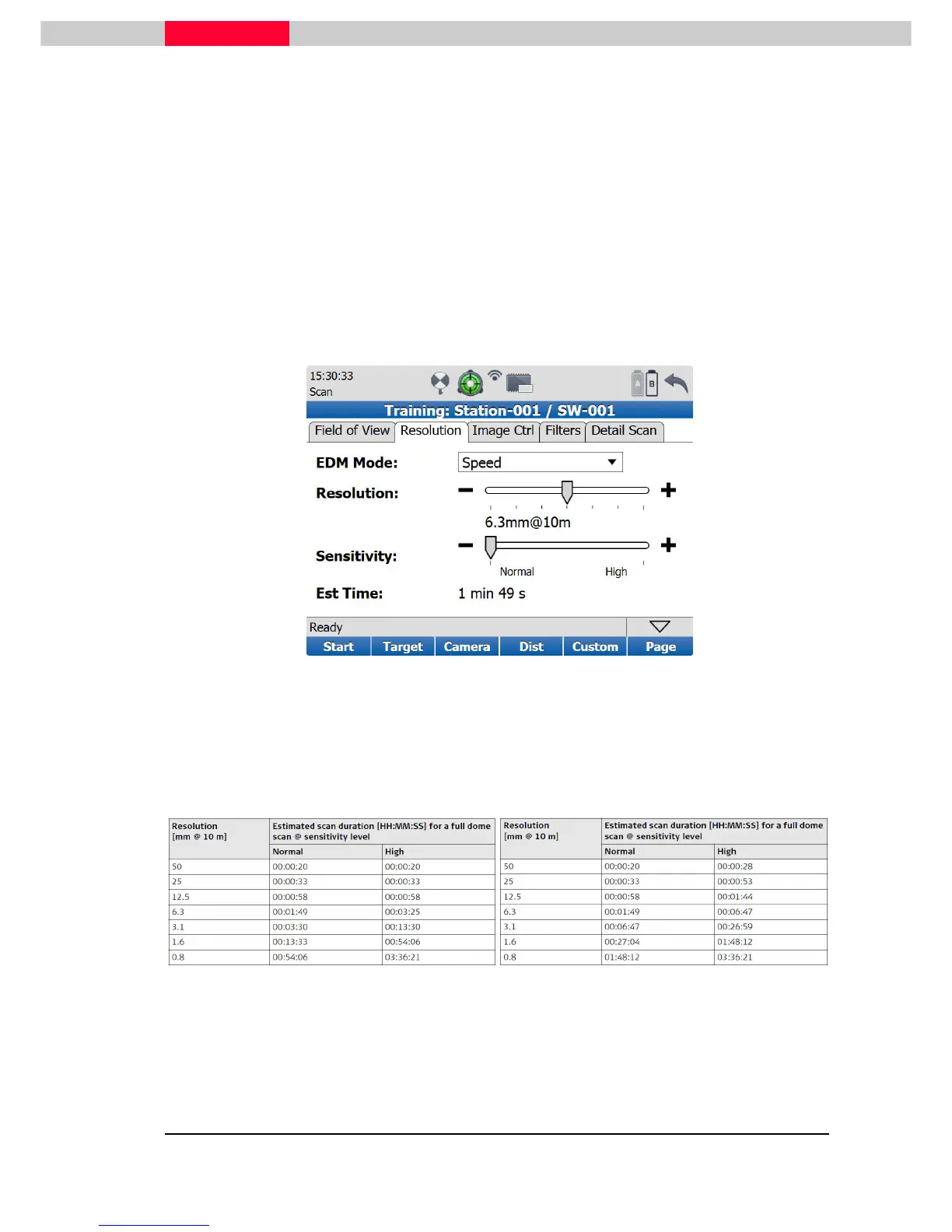 with the slider or the +/- symbols. In the following spread sheets the scanning time is listed,