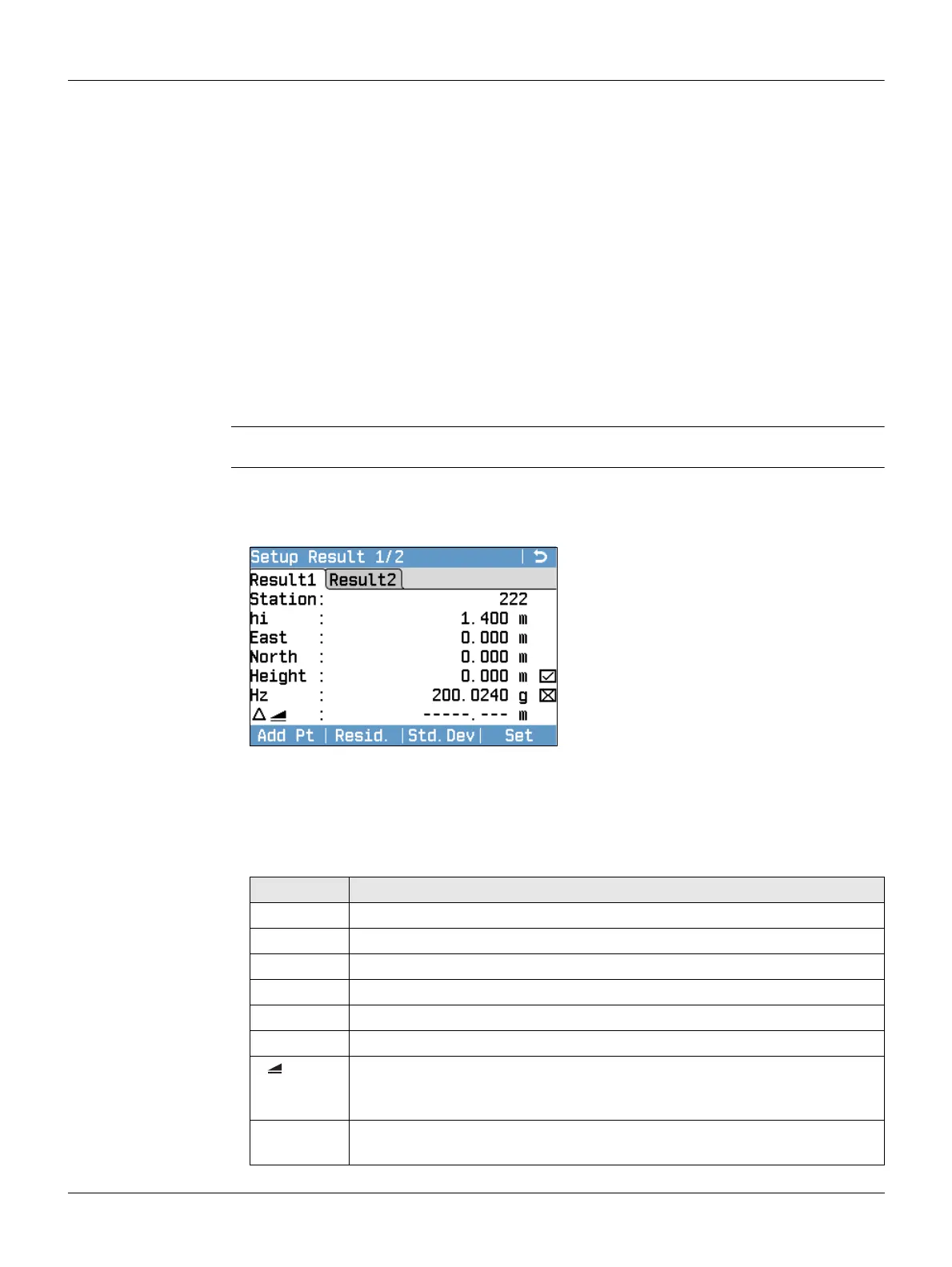 Station Setup Result This screen displays calculated station coordinates. The final computed results depend